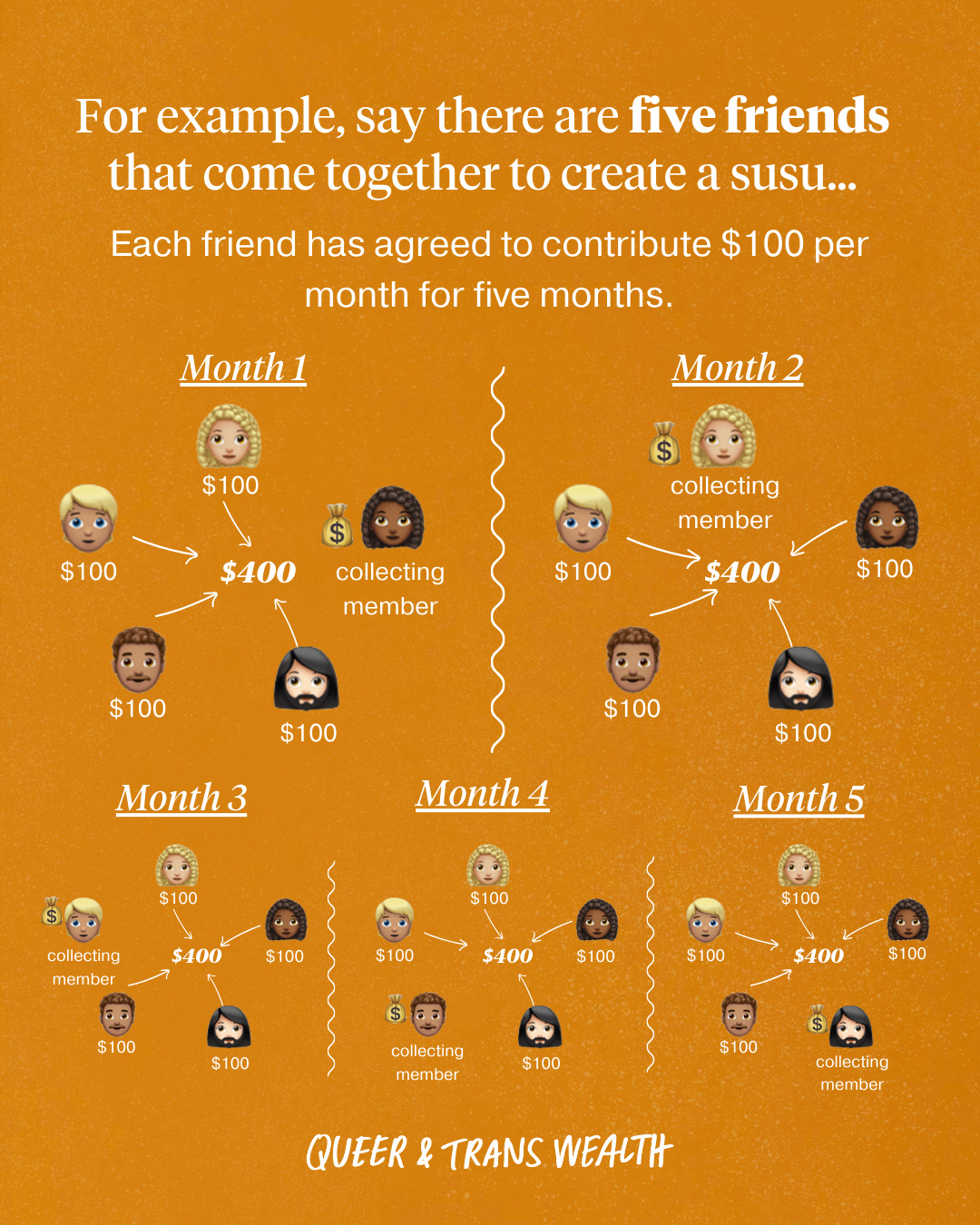 For example, say five friends come together and create a susu. They agree that each person will put in $100 per month for the next five months. That means that one month, one of the friends collects and receives the money from everyone else. Instead of having $100 in their savings, they now have $400. (It’s $400, not $500, because when the person collects, they are not putting in their $100 dollars.)