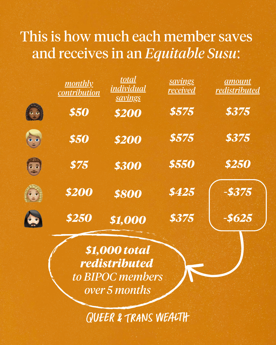 For white people to be a part of the susu, they have to commit to putting $200 or more per month. Since they put in a surplus, that surplus gets redistributed to the Black folks when it’s their turn to receive the susu.
